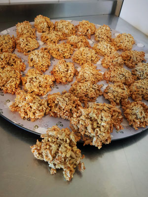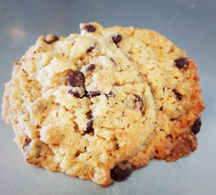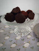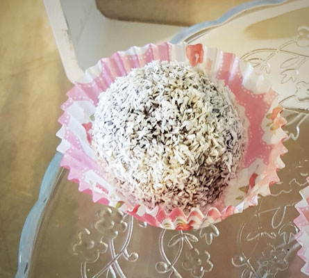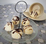 gefüllt mit dunkler Ganache und Aprikosenfruchtaufstrich, von aussen mit Kokosflocken,