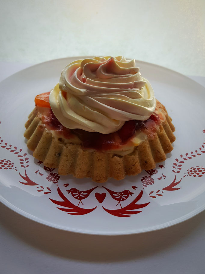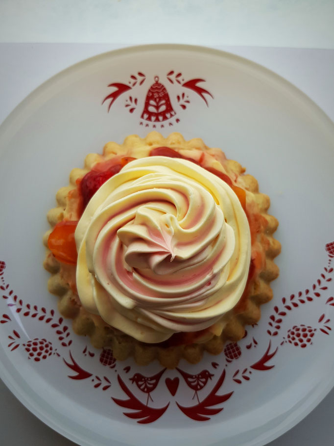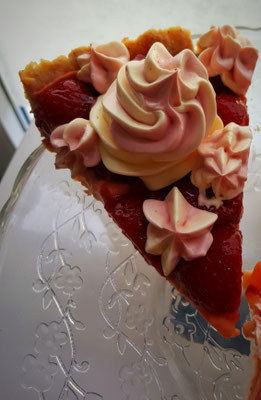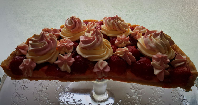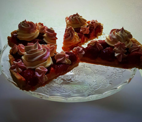 aus einem Haselnussmürbeteig, mit selbstgemachter Vanillepuddingfüllung und frischen Früchten.