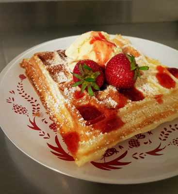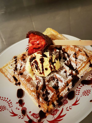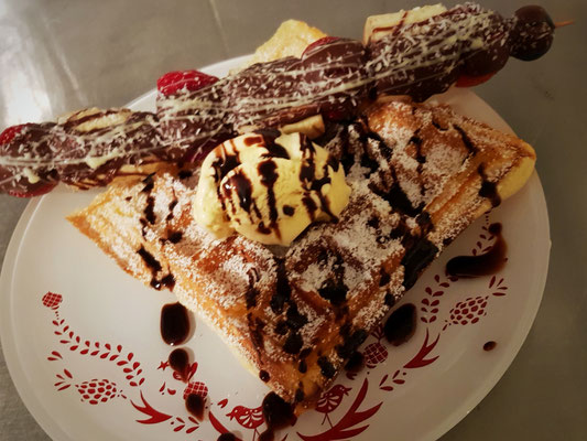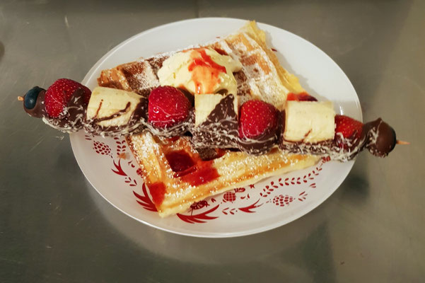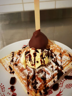 oder auch mit Vanilleeis (anderes auch möglich) dazu Erdbeersoße, Schokosoße, Karamellsoße