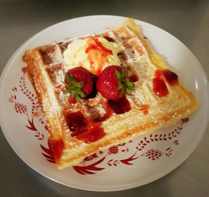 Waffeln kann man klassisch nur mit Puderzucker oder auch mit Schlagsahne und heißen Kirschen geniessen