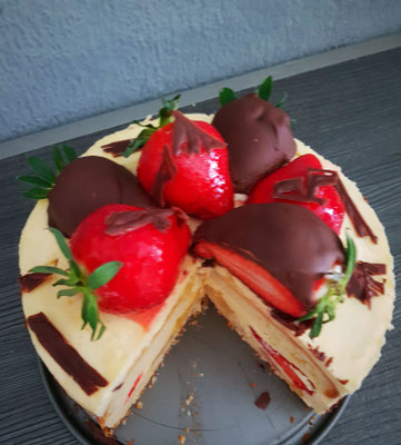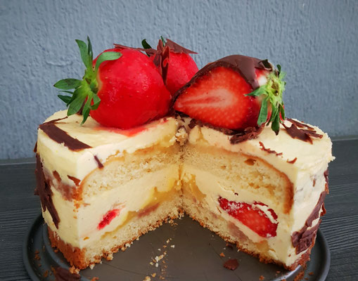 mit Biskuitboden, gefüllt mit frischen Erdbeeren und dekoriert